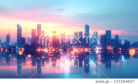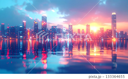 Night cityscape view of a modern urban downtown skyline with illuminated skyscraper buildings and blue sky architecture