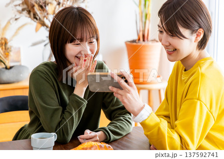 食事をシェアする20代女性の微笑みシーン