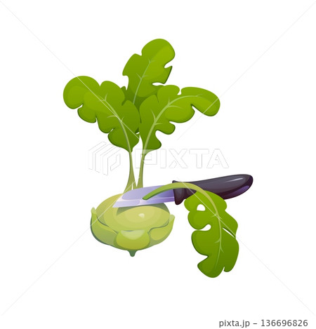 Green kohlrabi vegetable being cut with kitchen knife. Vector fresh leafy vegetable during food preparation process. Cartoon cooking food scene with cabbage head and sliced leaves for culinary recipe