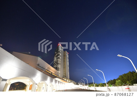 日本の横浜都市景観 横浜駅中央西口広場大屋根のライトアップと横浜ベイシェラトンホテル=1月9日