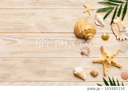 Summer time concept Flat lay composition with beautiful starfish and sea shells on colored table, top view with copy space for text