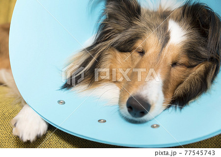 エリザベスカラーをしたままソファーで寝る犬 シェルティー