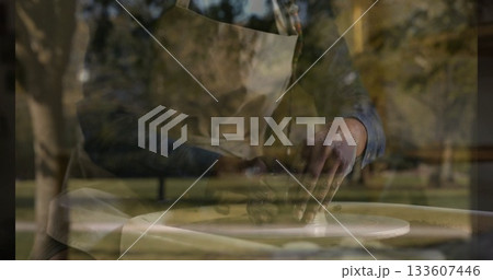 Female potter wearing apron shaping wet clay on pottery wheel at wooden table in park