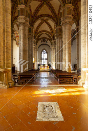 Sunlight illuminating the nave and altar of the Duomo di Pienza in Tuscany, Italy