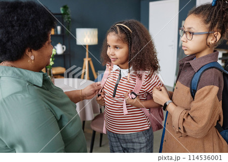 Portrait of little African American girl with backpack getting ready for school in morning with grandmother helping