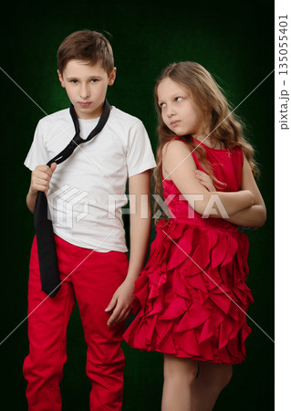 The girl looks reproachfully at the boy who angrily holds the tie. Childish grievances.