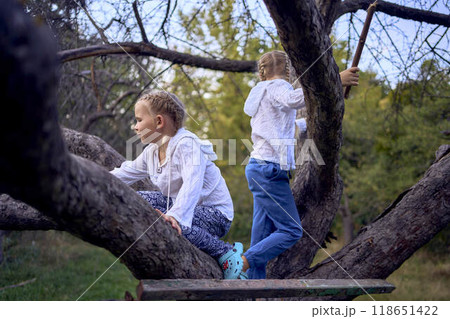 Beautiful little black girls in tent camping in the forest. Two little sisters sitting in a tent in autumn forest and hugging. Black girls wearing khaki coats and beige hats.
