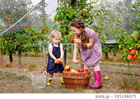 Portrait two siblings girls, little toddler and kid with red apples in organic orchard. Happy siblings, children, beautiful sisters picking ripe fruits from trees, having fun. Family, harvest season