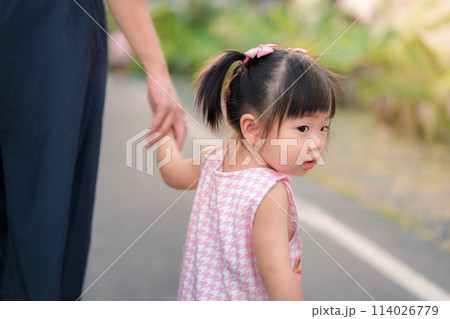 Asian mother disciplining her child, Asian girl kid being defiant with mom, Terrible two concept.