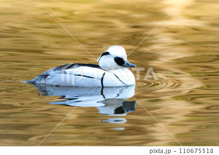冬に公園や湖で見られる純白の美しいパンダのような水鳥、ミコアイサ