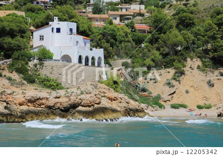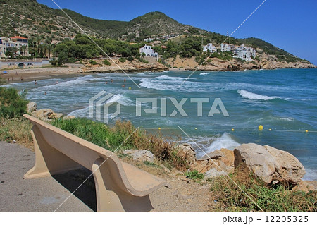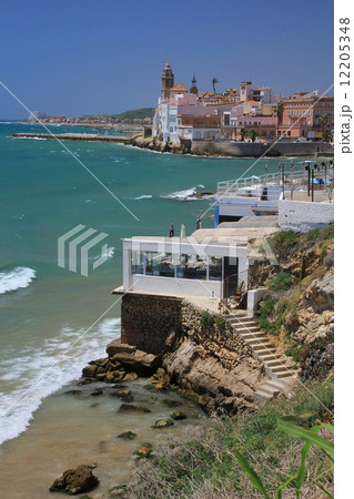 スペイン、カタルーニャ地方、シッチェスの海岸沿いの景色