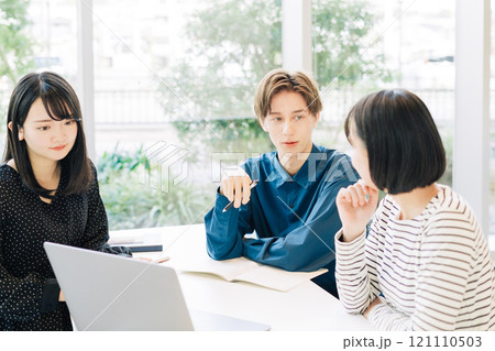 ゼミのミーティングをする大学生(男女)
