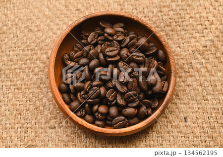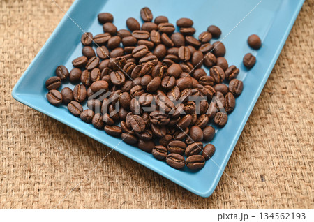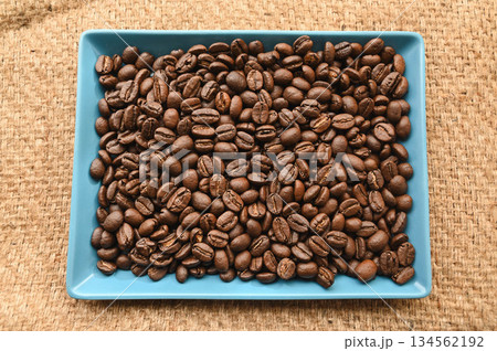 コーヒー用麻袋の上にロースト焙煎されたコーヒー豆が香りを放つ