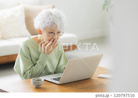 老眼 画面がよく見えずに老眼鏡をかけてパソコンを見るシニア女性
