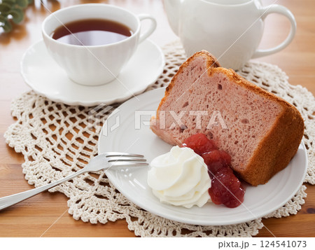 ホイップクリームと苺ジャムを添えた苺のシフォンケーキ
