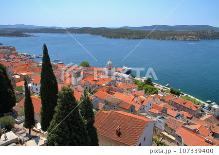 南欧クロアチアのアドリア海沿岸の町シベニク 高台の聖ミカエル要塞から望む世界文化遺産の聖ヤコブ大聖堂
