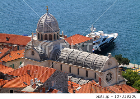南欧クロアチアのアドリア海沿岸の町シベニク ドームと特徴的な屋根を持つ世界文化遺産の聖ヤコブ大聖堂