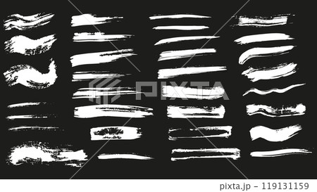 Collection of strokes made with white brush on black background, grunge elements, white rectangular strokes drawn with wide brush of different sizes, set of strokes for brushes and design