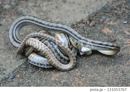 アオダイショウの幼蛇を捕食するシマヘビ(北海道・知床)