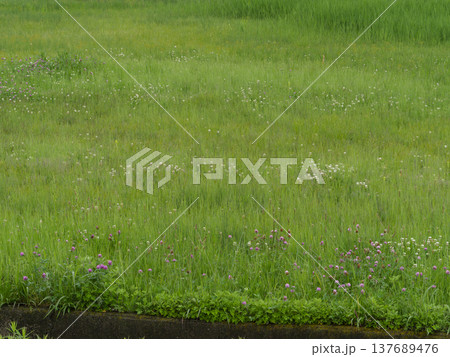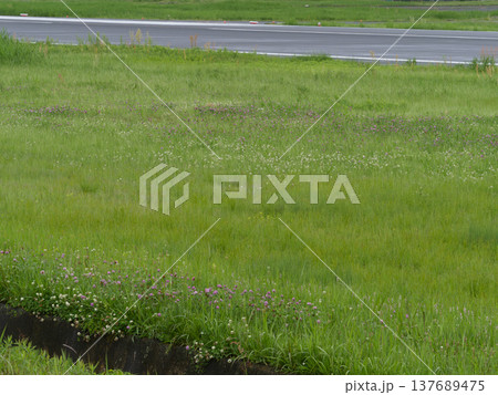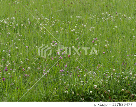 ムラサキツメクサとシロツメクサの花が咲く野原