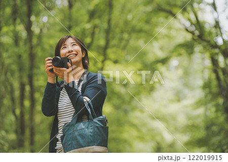 山で一眼レフカメラを持つ若い女性 トレッキングイメージ