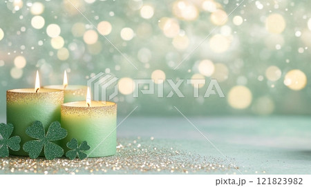 Green candles and shamrocks create a festive display for St. Patrick's Day celebration
