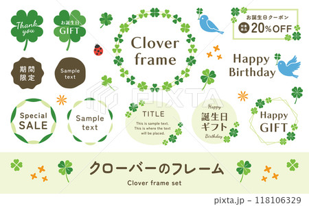四葉のクローバーのイラストセット 幸運のモチーフ素材 フレーム ベクター飾り