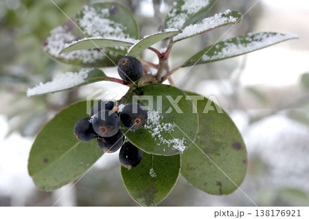 雪を被ったシャリンバイ(Rhaphiolepis indica)の実 東北