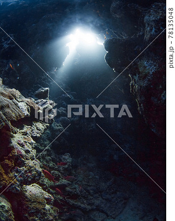 水中洞窟に射す太陽光 (ラスモハメッド国立公園、シャルムエルシェイク、紅海、エジプト)
