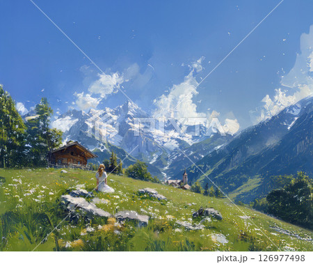 スイスのアルプス山脈と青空 油絵風の風景イラスト
