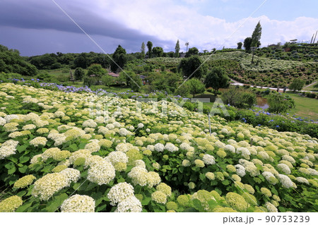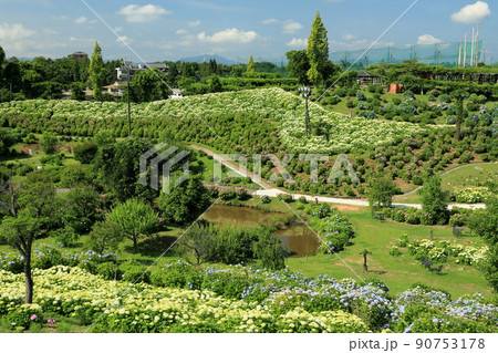 かざはやの里の植栽色豊かなあじさい畑の景色