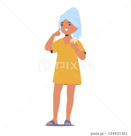 Cute pretty little girl child cartoon character applying facial cream after bath isolated on white