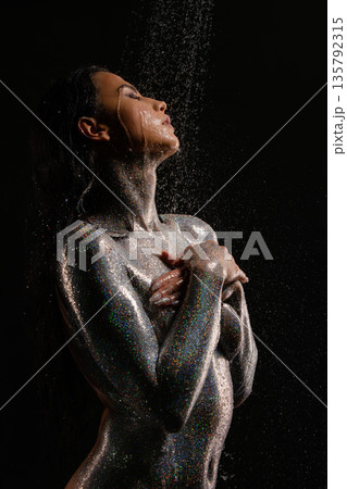 Ethereal woman with glitter body art standing under falling water on a black background