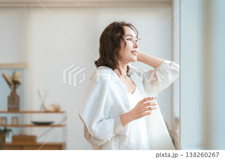 シャワーを浴びてリビングで水分補給する女性