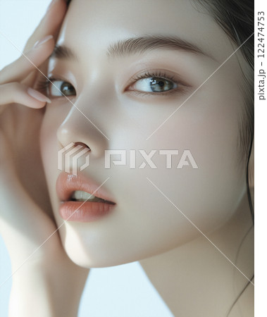 Captivating portrait of a woman with striking blue eyes and flawless makeup