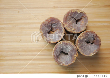Natural organic brown crystal rock sugar in jute napkin over wooden background.