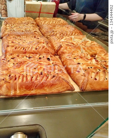Bakery display puff pastry pies with filling fresh baked close up vertical