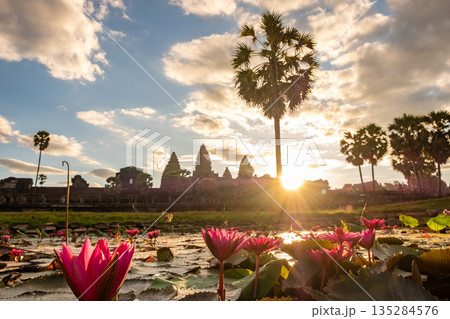 Beautiful pink water lily blooming in the pond in front of Angkor Wat one of the UNESCO world heritage site in Siem Reap, Cambodia during sunrise.