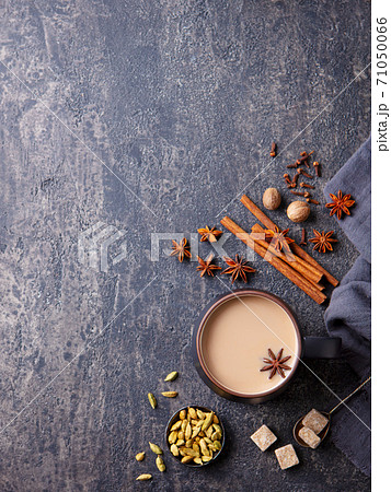 Indian masala tea with milk and spices in mug. Grey background. Copy space. Top view.