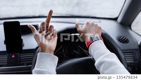 Traffic problems, violation of rules, anger and quarrel. Upset millennial african american lady controls steering wheel with her hand and shows middle finger, view of window with drops and city road
