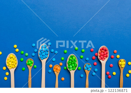 delicious colorful sweet candies on spoon on colored background . Confectionery decor top view with copy space