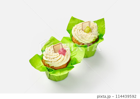 Two cupcakes with whipped cream in green paper wrappers