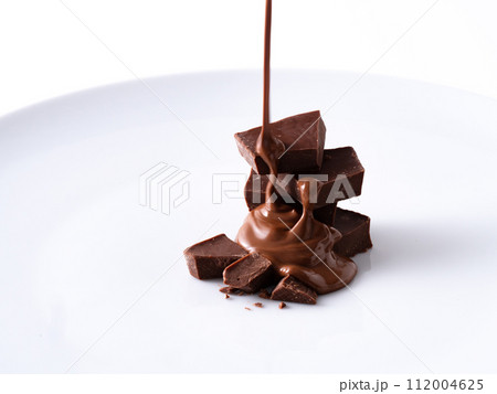 おしゃれなチョコレートがチョコレートソースの中に落ちるイメージ 白背景