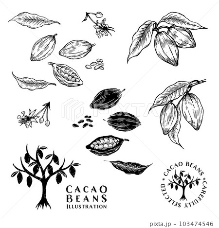 いろいろなカカオ豆・花と葉っぱの水彩イラスト/白