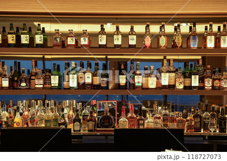 バーカウンターに並ぶ洋酒とカウンター