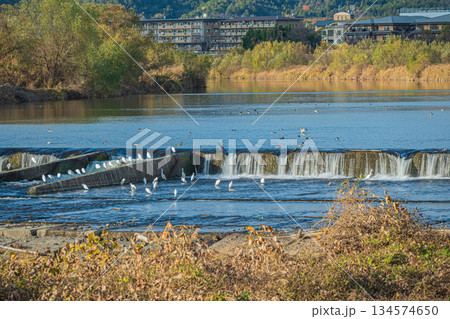 堰の下で餌探しをするシラサギ(コサギ)の群れ 京都市鴨川