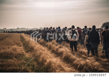 Refugees crossing border. Migrants cross border illegally.