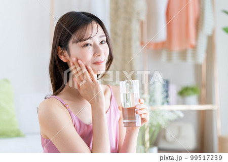 寝室で水分補給する若い女性