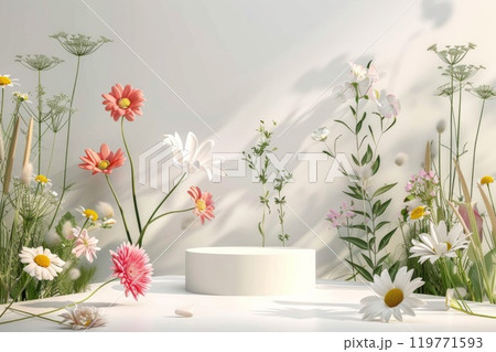 Cylinder podium for product placement surrounded by different flowers. Neural network ai generated art