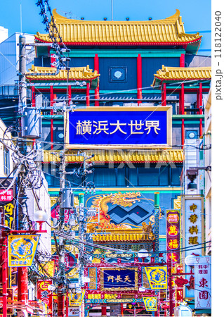 日本の横浜都市景観 9月、横浜中華街・関帝廟通りから「天長門」(関帝廟通)などを望む。奥は横浜大世界